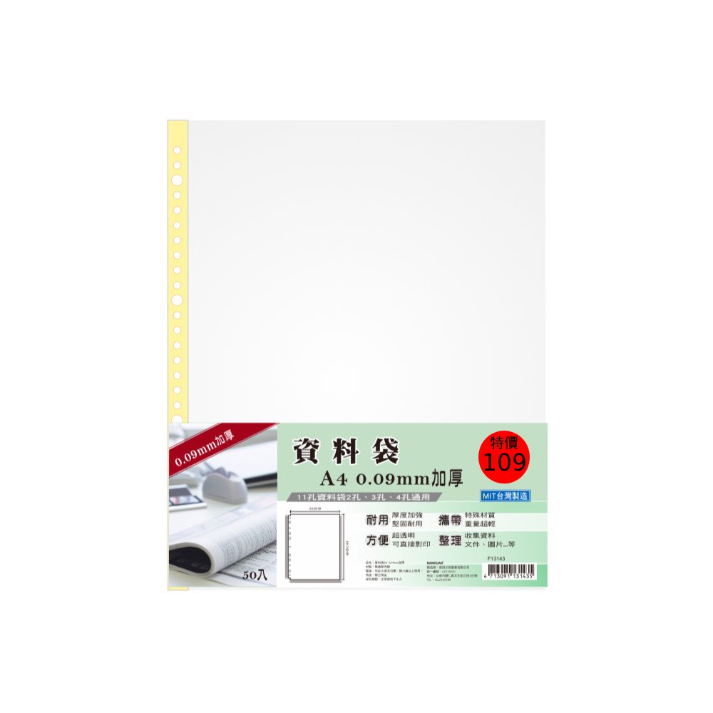 [加厚] A4 11孔 白邊資料袋 0.09mm 29.7x22cm 50 入