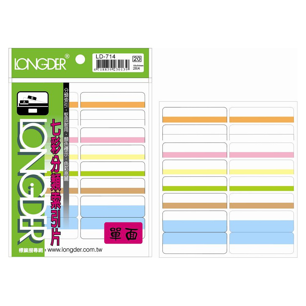 龍德 LD-714 七彩分類索引片 模造紙+透明PVC 白.橘.牛皮紙.粉紅.淺黃.淺藍.淺黃 18x54mm 14格 28張/包