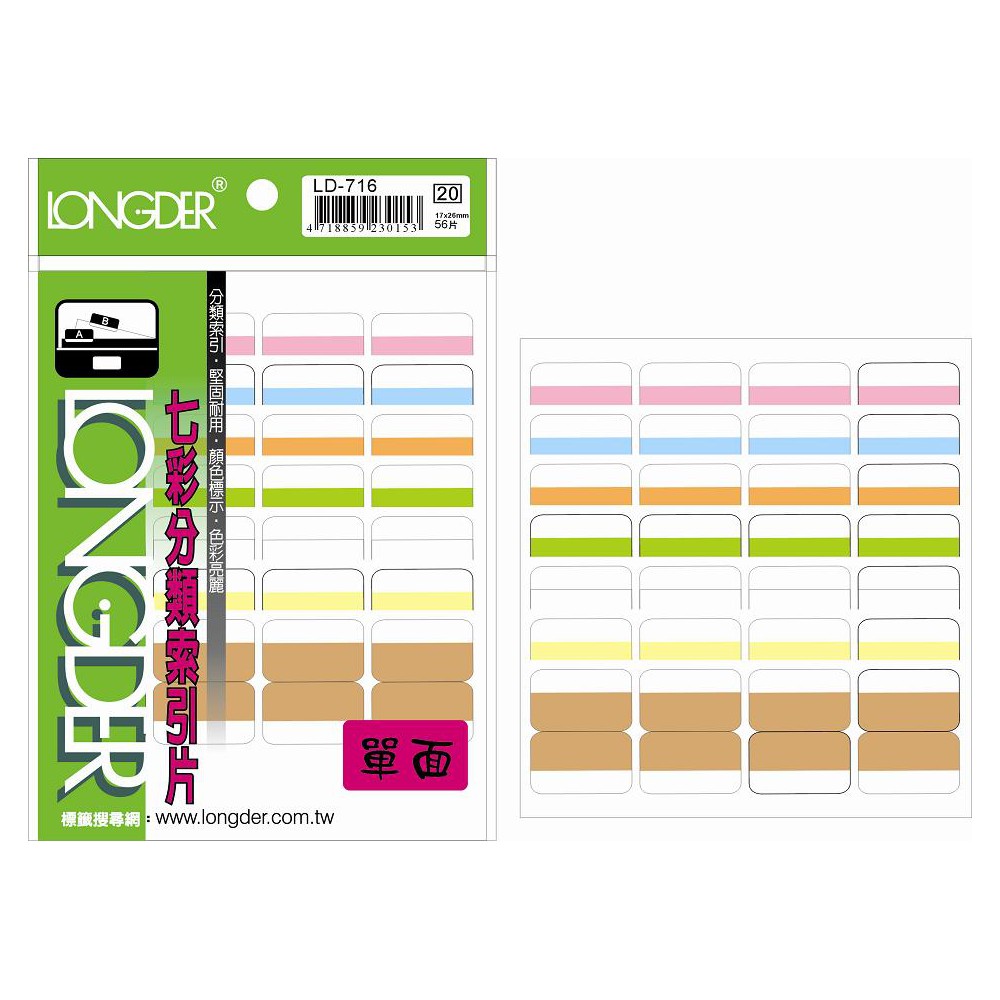 龍德 LD-716 七彩分類索引片 模造紙+透明PVC 白.橘.牛皮紙.粉紅.淺黃.淺藍.淺黃 17x26mm 28格 56張/包