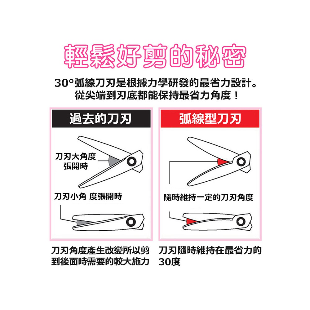 -採用流體力學原理、改良刀刃的開闔角度,保持30度特殊弧形,從底部到尖端皆可輕鬆順暢剪裁。