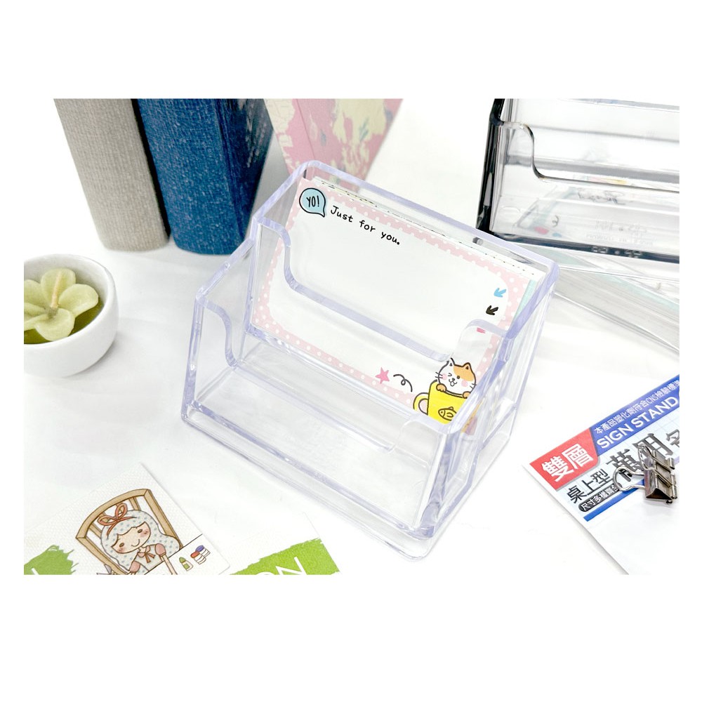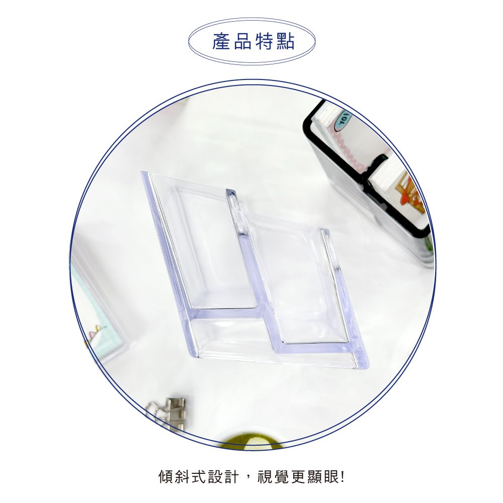 § 雙層設計,可擺放兩款名片。§ 一體成型設計,耐用度高。§ 清澈的透明度,名片清晰可見。§ 規格:10.2x6.3x8.3cm,2種款式。§ 台灣設計製造,品質有保障。§ 本產品塑化劑符合CNS檢驗標準。