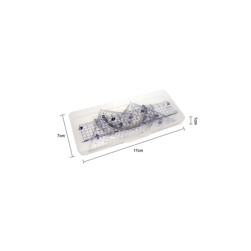 尺寸: 17x7x1cm▶盒裝設計,好攜帶▶一組內含15cm文具尺、正三角板、直角三角板、量角器各一