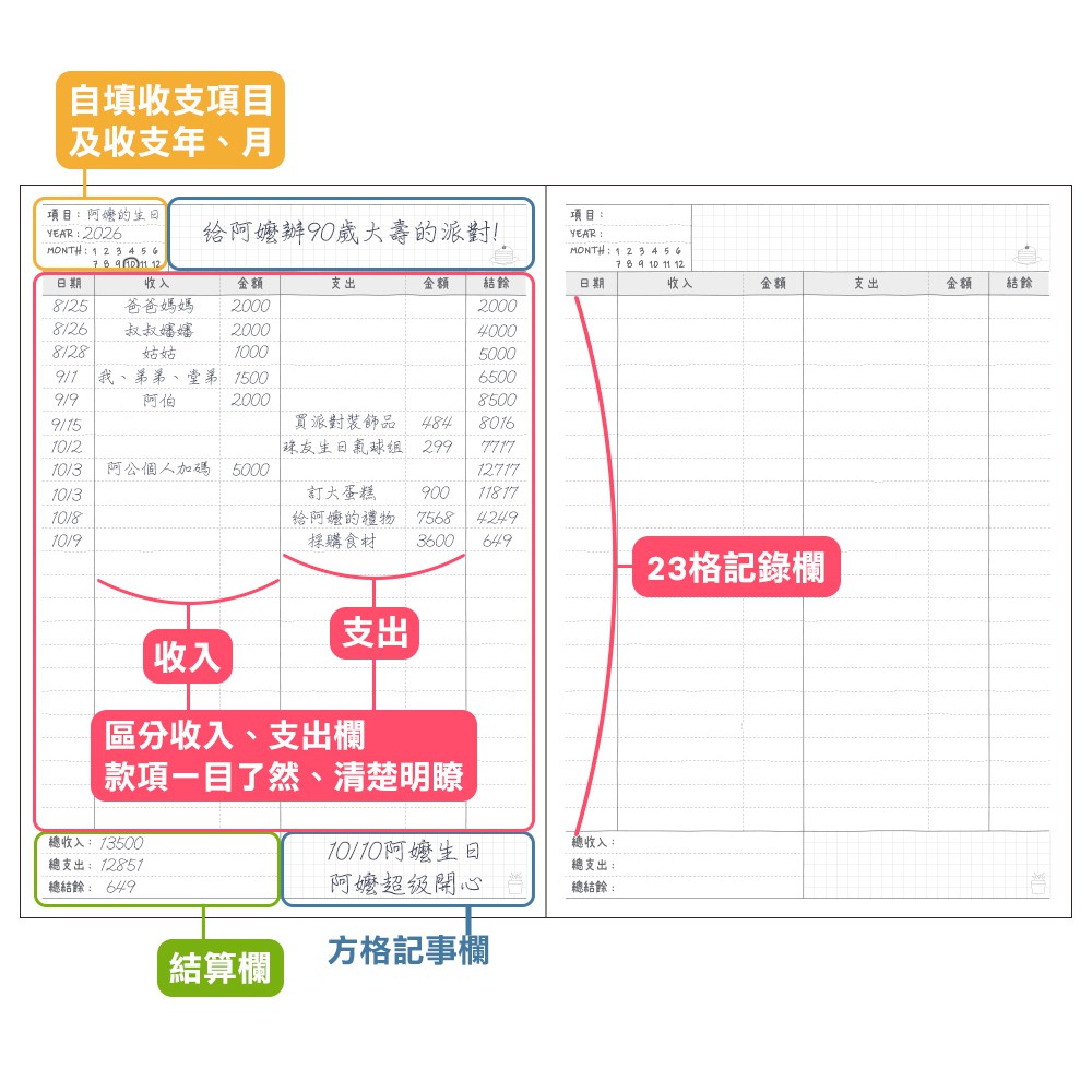 自填收支項目及日期,可以自由運用...