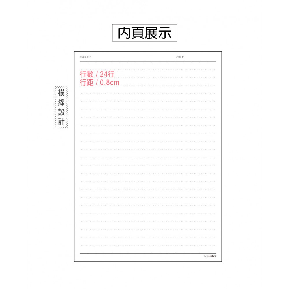 • 橫線內頁,行數24行,行距0.8cm