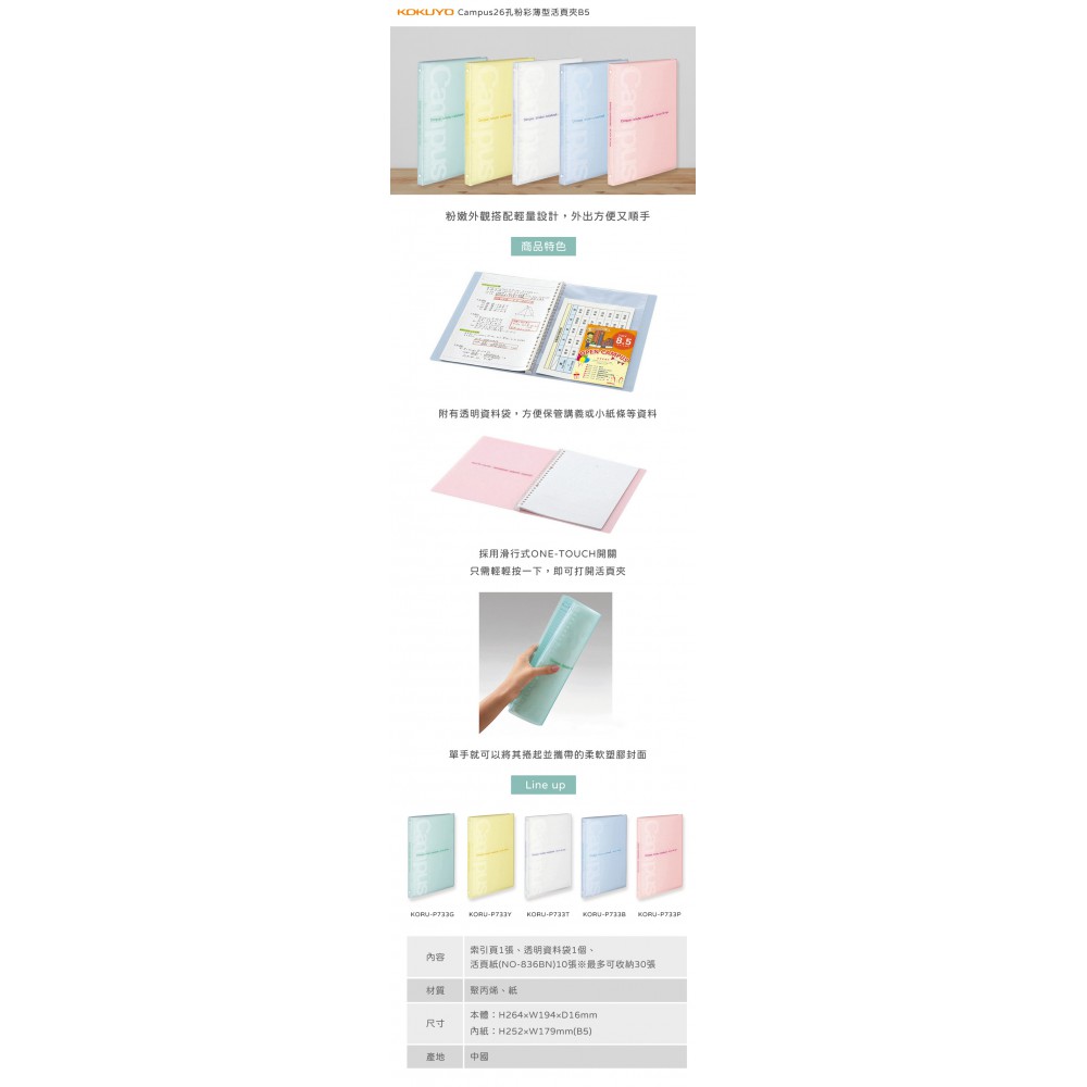 產品名稱:KOKUYO Campus 26孔輕量型活頁夾P733 B5