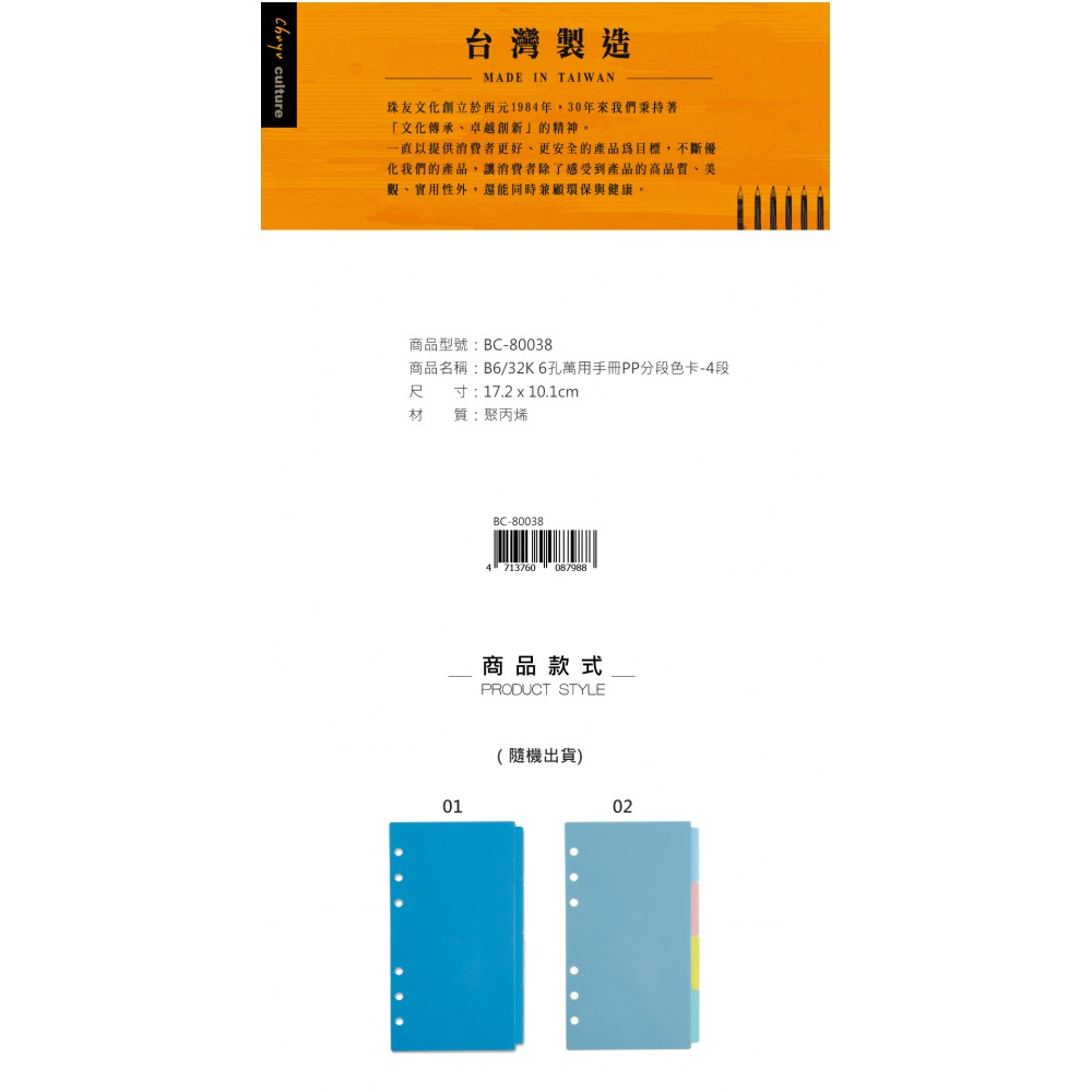 珠友 B6/32K 6 孔萬用手冊 PP 分段色卡-4 段/手帳內頁