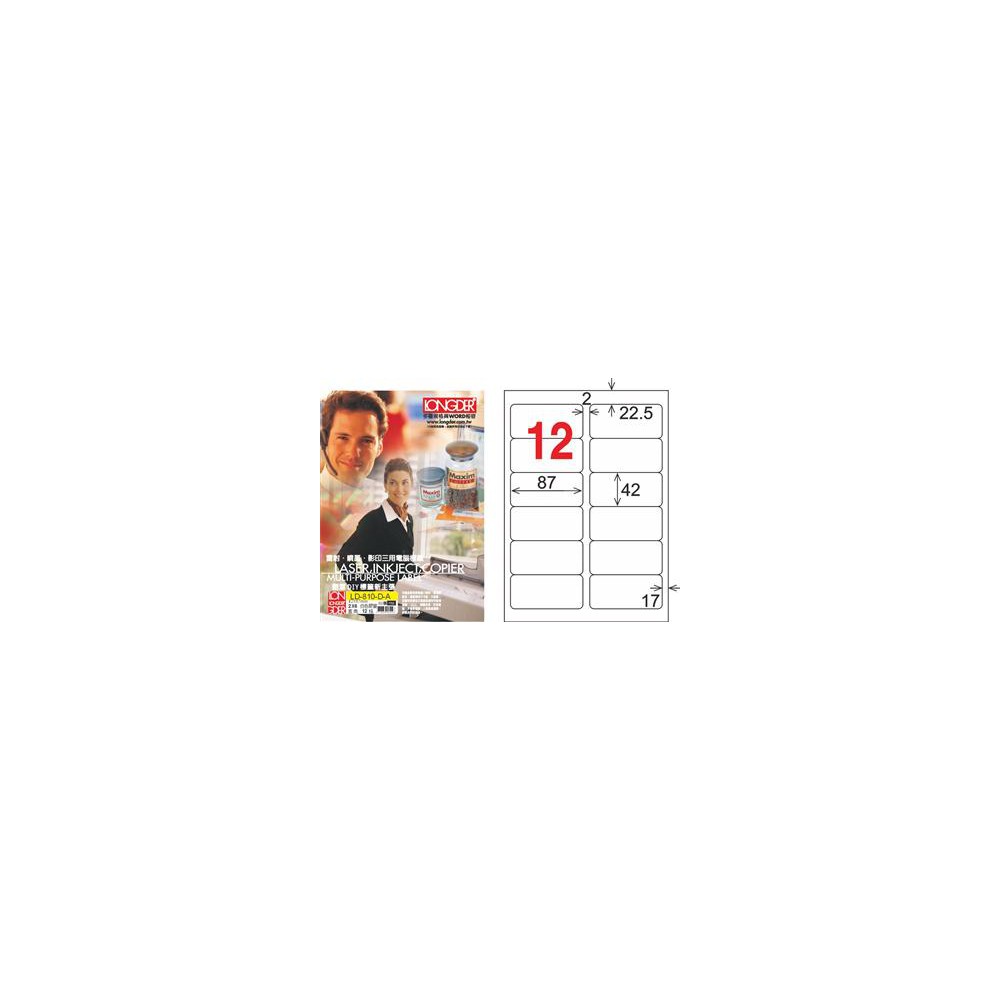 龍德 LD-810-D-A A4雷射影印電腦標籤 白色PET材質 白色 42x87mm 12格 80大張
