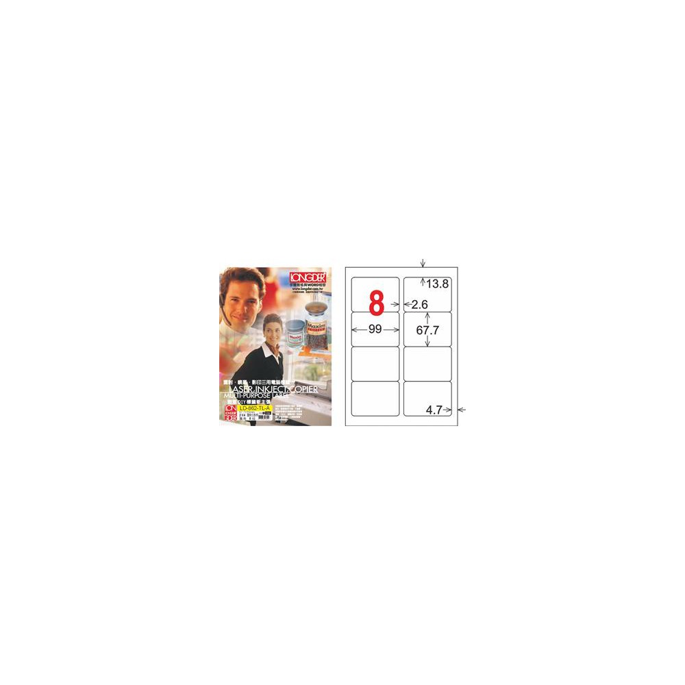 龍德 LD-862-TL-A A4雷射影印電腦標籤 透明PET材質 透明 67.7x99mm 8格 80大張